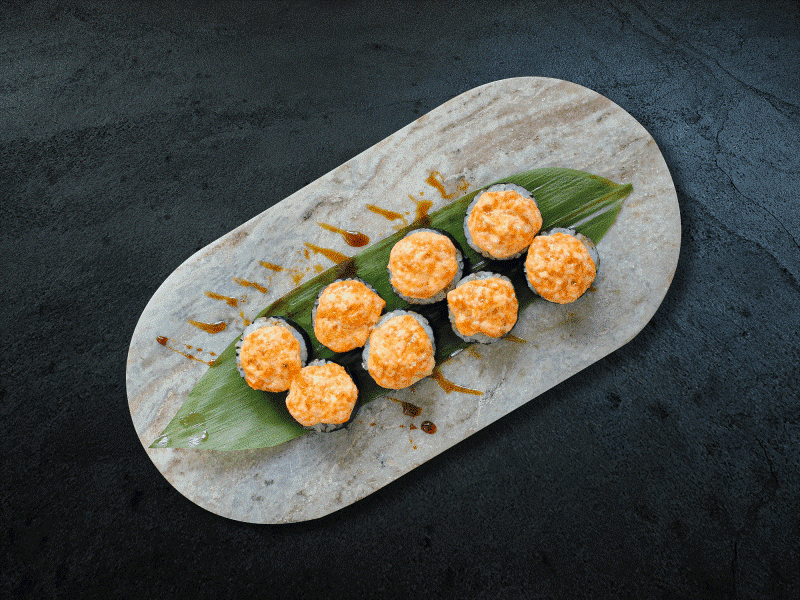 Рис, нори, угорь, огурец, авокадо. Соус : креветка, творожный сыр, майонез, масаго, унаги соус, кунжут белый 237 гр