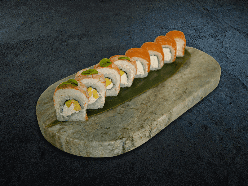 Рис, нори, творожный сыр, авокадо, креветка, охлажденный лосось 230 гр