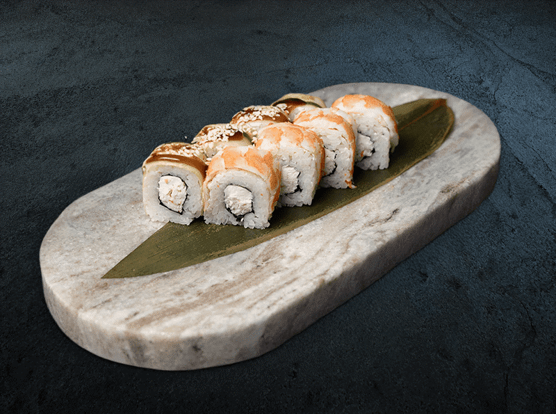 Рис, нори, творожный сыр, сурими, креветка, огурец, унаги соус, кунжут 232 гр