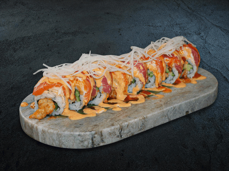 Рис, нори, лосось охлажденный, тунец, креветка темпура, сурими, огурец, соус спайс, соус чили-сладкий, дайкон 350 гр