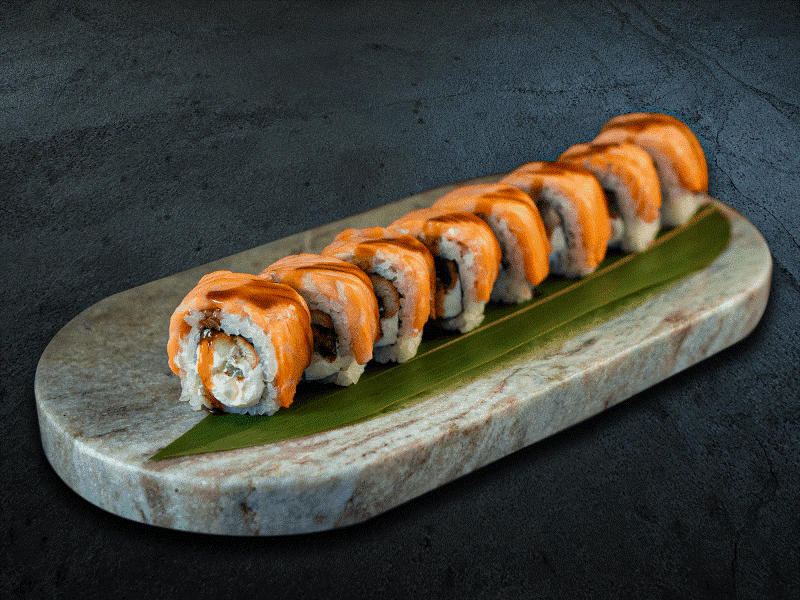 Рис, нори, угорь, творожный сыр, лосось охлажденный ОПАЛЕННЫЙ, унаги соус 240 гр