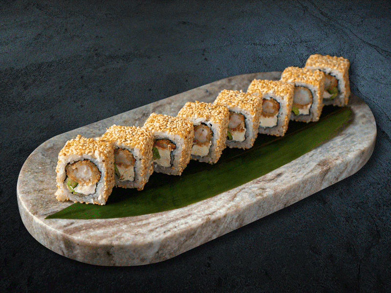 Рис, нори, креветка темпура, сыр творожный, огурец, кунжут 195 гр