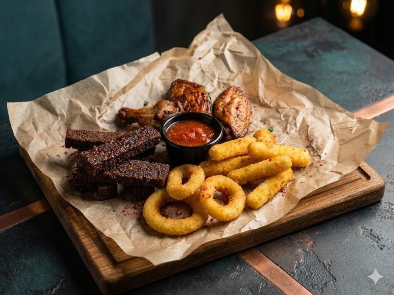 Сытная закуска для компании с классическими снеками к напиткам. Хрустящие и сочные позиции отлично сочетаются с соусами и подходят для общего стола. Состав: куриные крылья, сырные палочки, гренки, луковые кольца, панировка, соус BBQ, соус тартар.