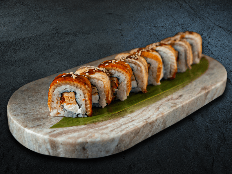 Угорь, креметте, тобико, томаго, унаги соус, кунжут