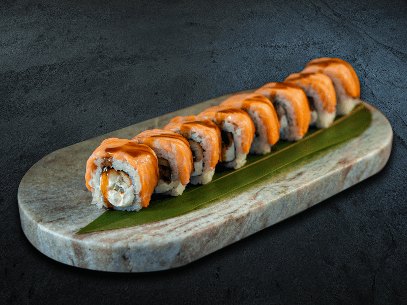 Лосось опаленный, угорь, креметте, унаги соус