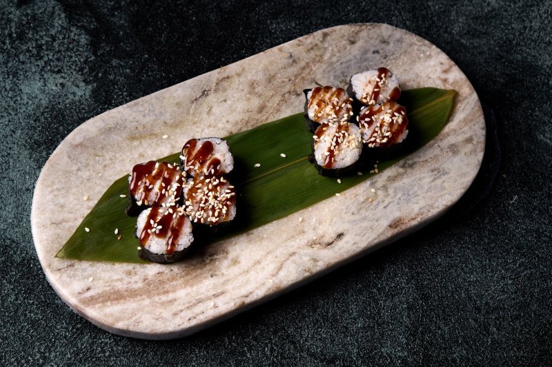 Угорь, рис, соус унаги, кунжут
