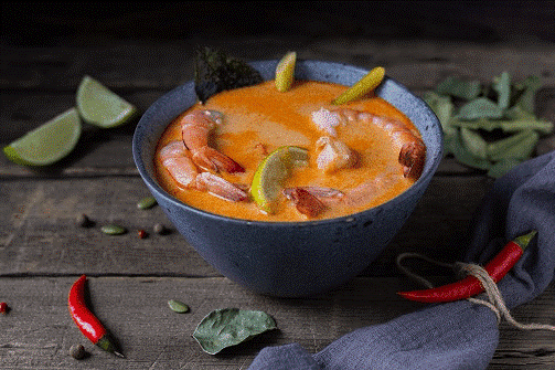 Креветки, шампиньоны,лемонграсс, лайм, кокосовое молоко, рыбный соус, мидии, имбирь, чили, чеснок.